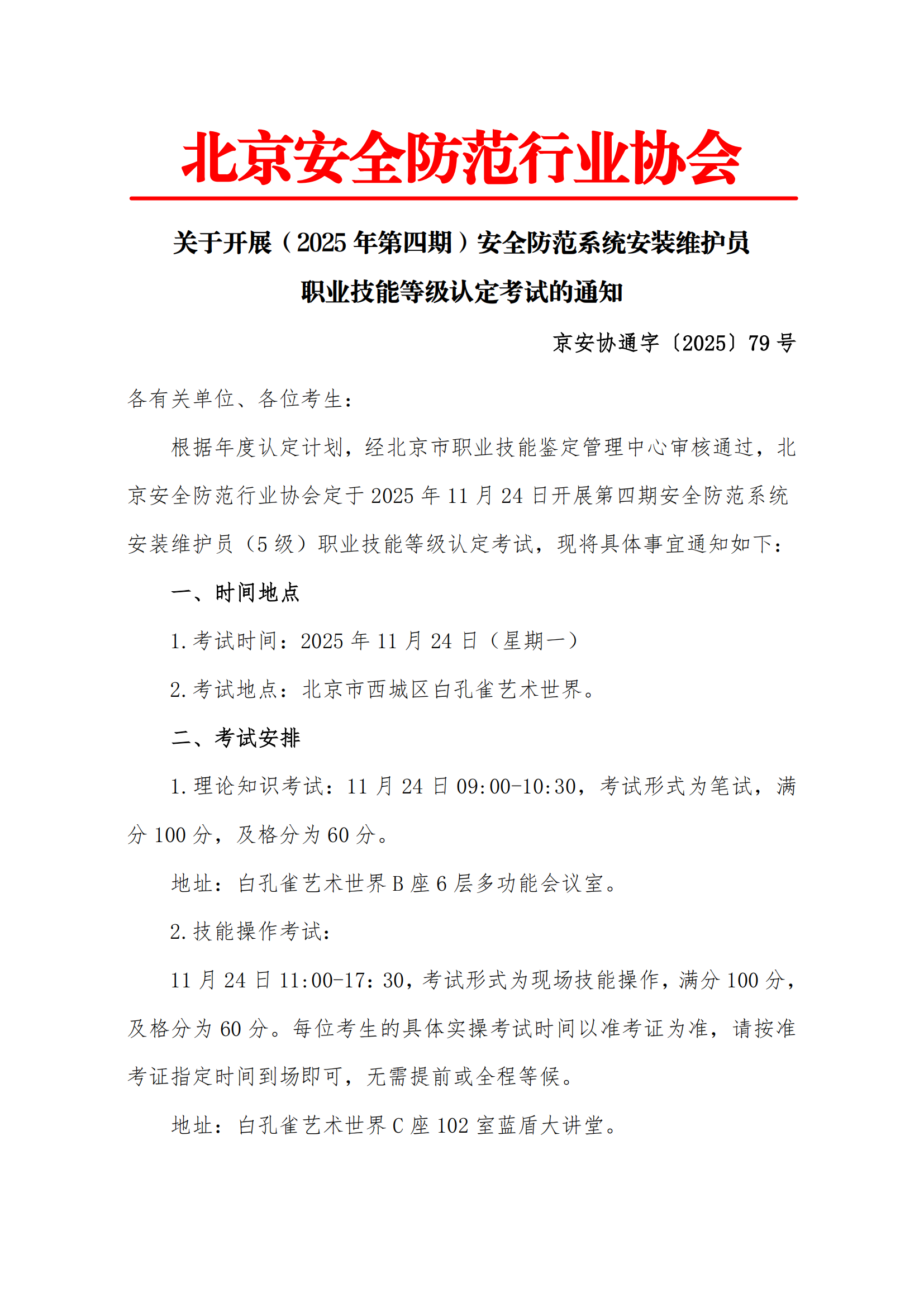 关于开展(2025 年第四期)安全防范系统安装维护员职业技能等级认定考试的通知