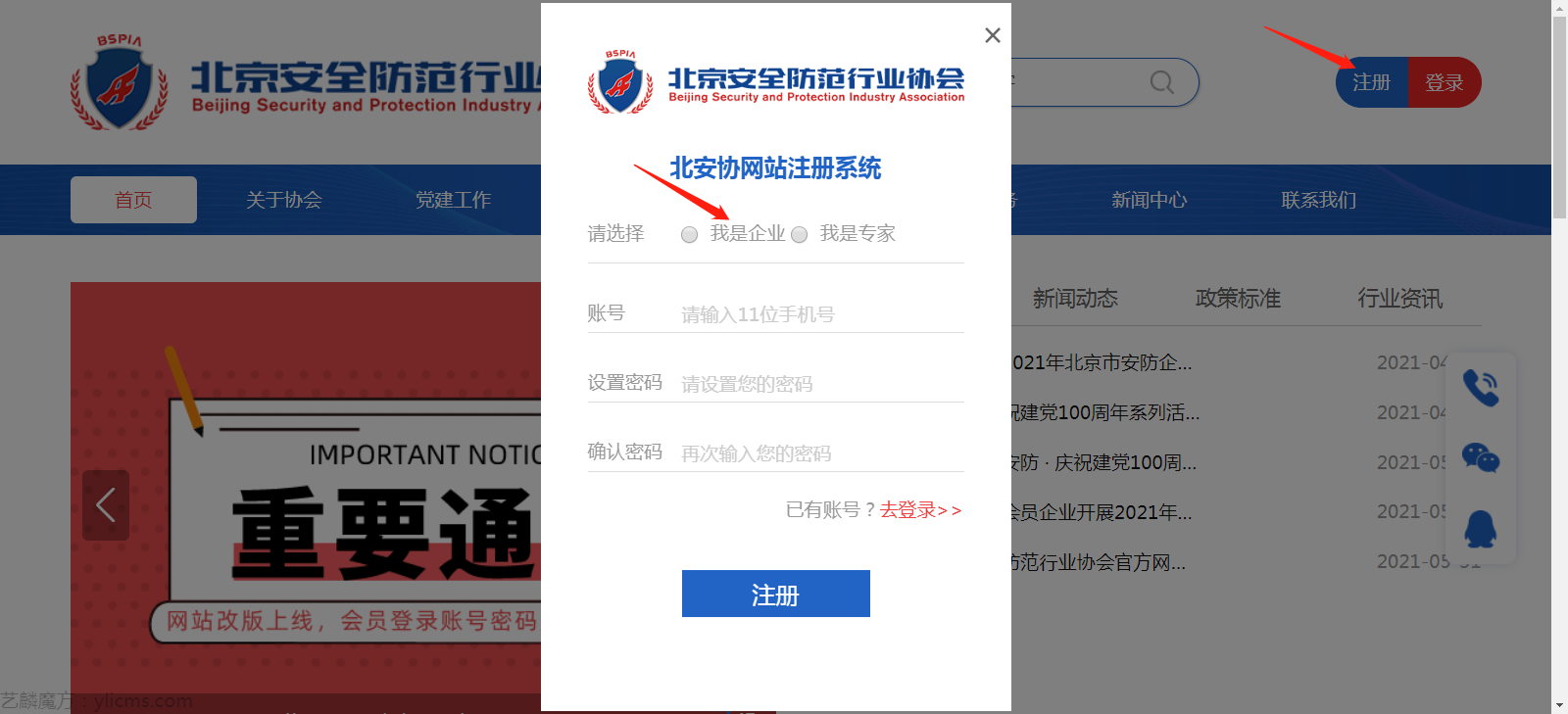 一、企业进入北京安全防范行业协会官网注册企业账户。